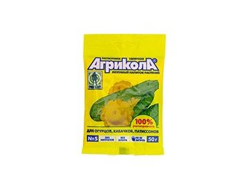 Подкормка удобрением Агрикола 5. Для приготовления рабочего раствора 25 г удобрения растворите в 10 литрах воды и обработайте 10—25 кв.м посевов в зависимости от способа обработки.
