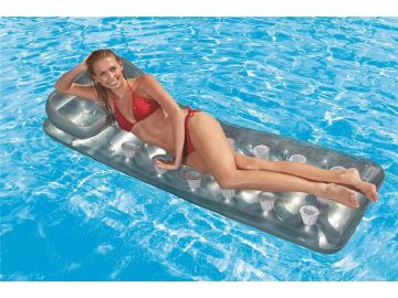 Прямоугольная форма, надувной подголовник, специальная система поддержки (конструкция coil beam с внутренними перегородками I-beam pillow), которая не позволяет матрасу сминаться, 18 лунок — для стаканов с напитками — вот его главные достоинства!